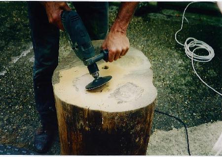A: The mid-depth depression was made by initially cutting intersecting lines in a star shape using an angle grinder. Then a chisel was used to remove the ridges and finally a disk sander used to smooth it. The deepest depression was made in a similar way and then a blow torch used to burn out the ridges to the depth required. The shallowest depression was simply ground out with a disk sander.