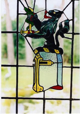 The same finishing technique was used on the 'pot-helm' in the next image. This form of helm was in use during the fifteenth century and, due to it's weight, was almost certainly only intended for the joust or tilt. It is shown here complete with crest, wreath and mantling. The same crest is shown in the stained glass window - here atop a barrel helm.