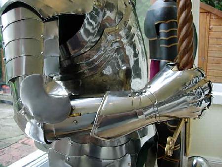 In January 2006 besagues or rondels were made as a late addition to this armour. These are suspended by straps from the lower edge of the pauldron imparting an additional degree of defense to the vulnerable area around the arm opening of the cuirass.